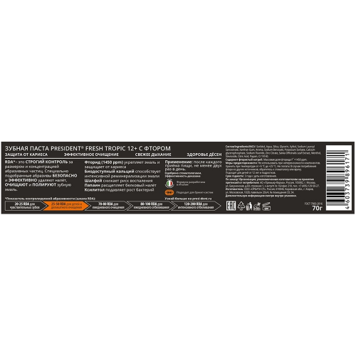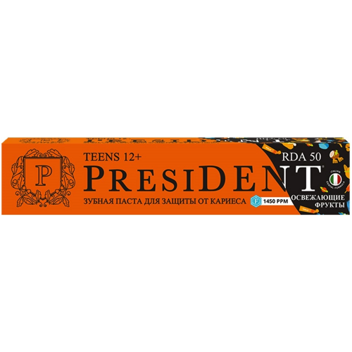 Детская зубная паста PRESIDENT® Fresh Tropic 12+ обеспечивает защиту от кариеса, эффективное очищение, здоровье дёсен и свежее дыхание. Эффективность клинически доказана. Одобрено детскими стоматологами. Подходит для брекет-систем.