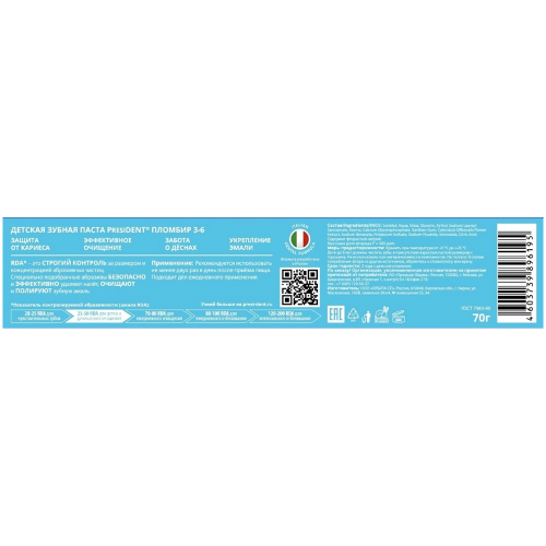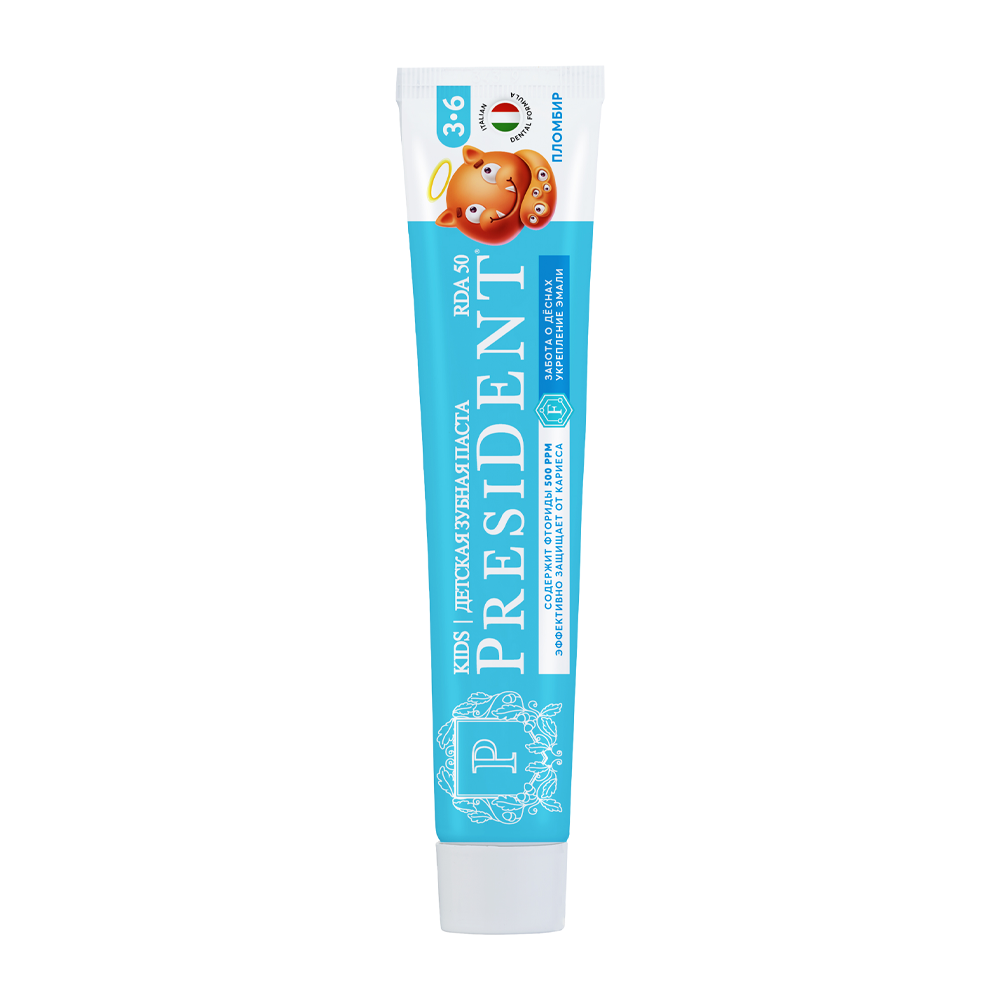 Детская зубная паста PRESIDENT® Пломбир от 3 до 6 лет обеспечивает защиту от кариеса, заботу о деснах, укрепление эмали и эффективное очищение. Гелевая форма зубной пасты облегчает очищение в труднодоступных местах. Эффективность клинически доказана. Одобрено детскими стоматологами. NATURALS INGREDIENTS - с натуральными ингредиентами. Биодоступные активные компоненты. Гелевая форма облегчает очищение в труднодоступных местах.